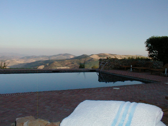 | View from pool looks uphill at El Torcal and downhill over the countryside. |